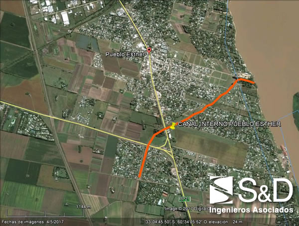 El miércoles 20 de Diciembre de 2017, en la localidad de Pueblo Esther se anunció el llamado a Licitación Pública para la ejecución de la obra REACONDICIONAMIENTO CANAL INTERNO PUEBLO ESTHER y se firmó el acuerdo correspondiente con el GSF, quién financiará el costo del total de la obra, superior a los $ 20.000.000 de presupuesto base. Se hicieron presentes las siguientes autoridades. El Sr. Ministro del MIT Ing. José Garibay, El Senador del departamento Rosario el Dr. M. Cappiello y las Autoridades Comunales , presididas por el Sr. Martín Gherardi. El Proyecto Ejecutivo y Armado de Pliegos estuvo a cargo de los Profesionales de la consultora S&D Ingenieros Asociados. Con esta obra se logrará atenuar en gran forma los efectos de inundaciones que se presentan en la Localidad de Pueblo Esther, para lo cual se proyectó la modificación de 2 alcantarillas rectas tipo A2 de 5m de luz, 1 alcantarilla de 2 tramos de 3,00 de luz con una obra de derivación por calle Perón y descarga al Río Paraná a través de un conducto vertical y manta de bloques de hormigón vinculadas con geo textil. Ejecución de Conducto en Calle Perón será con Módulos Prefabricados de hormigón doble de 2 m de ancho por 2 m de altura. También se contempla la limpieza, ampliación y rectificación de más de 2000 m del Canal Interno.
